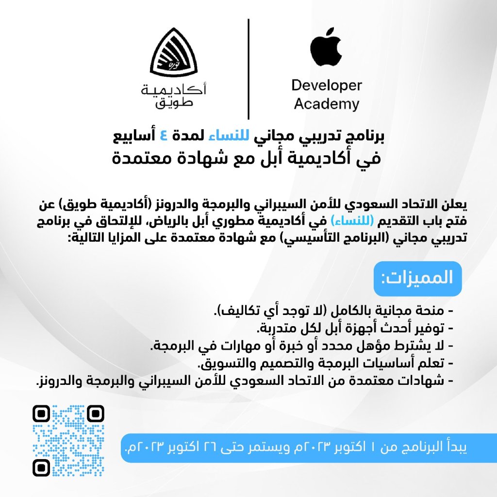 أكاديمية طويق التابعة للإتحاد السعودي للأمن السيبراني تعلن عن برنامج تدريبي مكثف للنساء مع شهادة معتمدة (البرنامج التأسيسي لمطوري أبل)، لا يشترط مؤهل محدد أو خبرة أو مهارات في البرمجة.